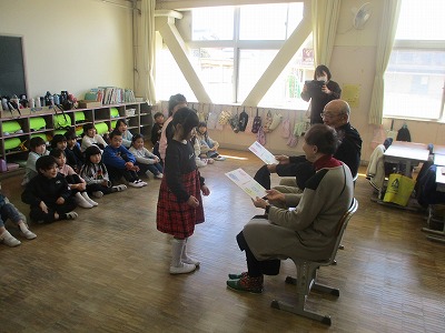 3月16日に、学校安全ボランティア会議を開催しました。この会議は、学校安全ボランティアに登録されている方を対象に行いました。普段の安全面や子どもたちの様子について、気づいたことをお聞きしました。また、感謝の気持ちをこめて1年生からボランティアの方に歌のプレゼントと色紙をお渡ししました。これからも子どもたちを見守ってください。