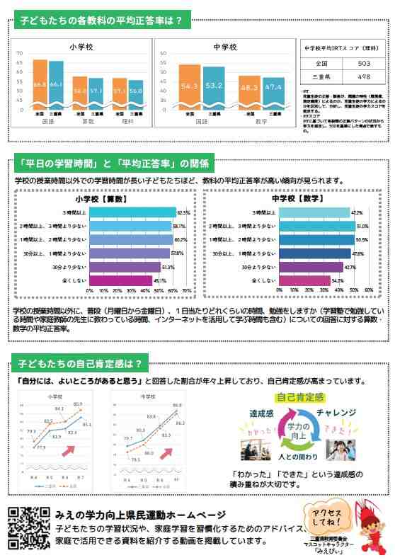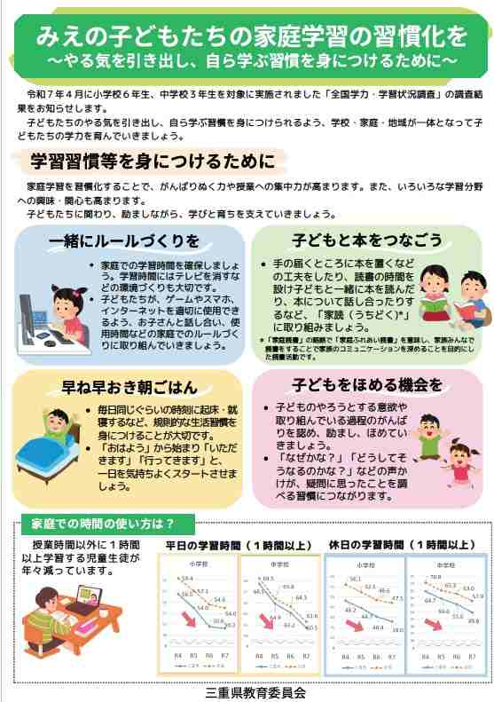 三重県教育委員会が発行している「学力向上に係る保護者の方へのチラシ」となります。子どもたちがやる気を出して、家庭学習を習慣化させるポイントが書いてあります。