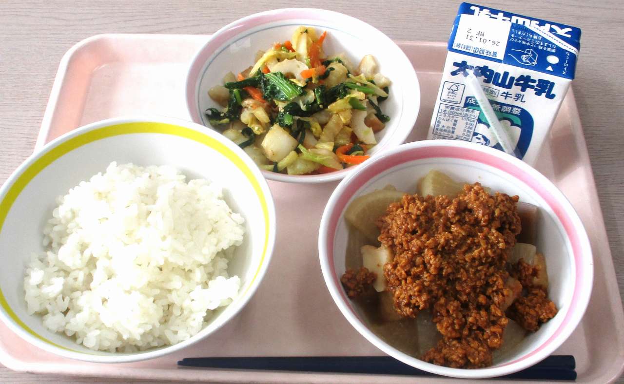 今日の給食は・・・麦ごはん、牛乳、おでんの肉味噌かけ、ごまあえです。