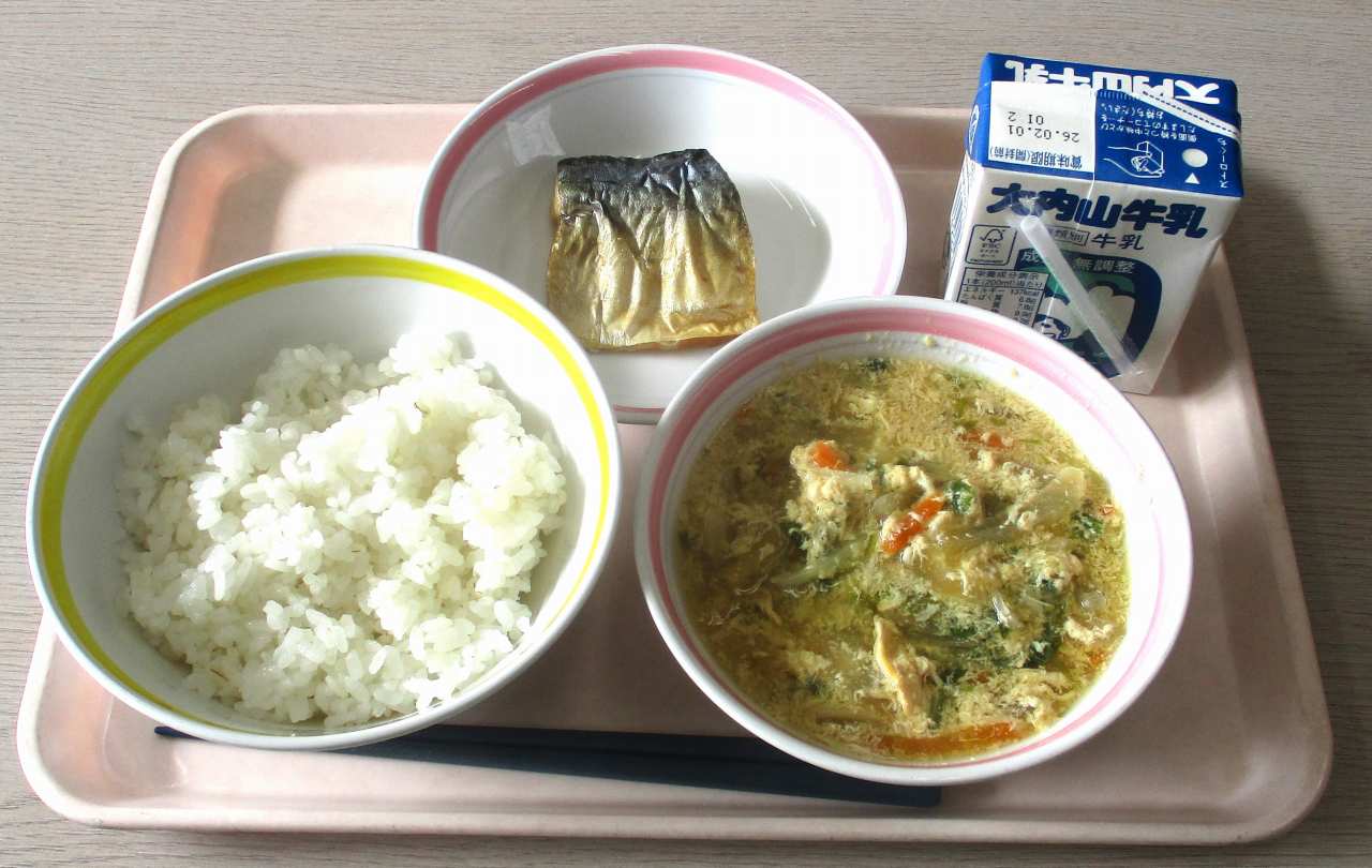今日の給食は・・・麦ごはん、牛乳、サバの塩焼き、ぽかぽかかきたま汁です。