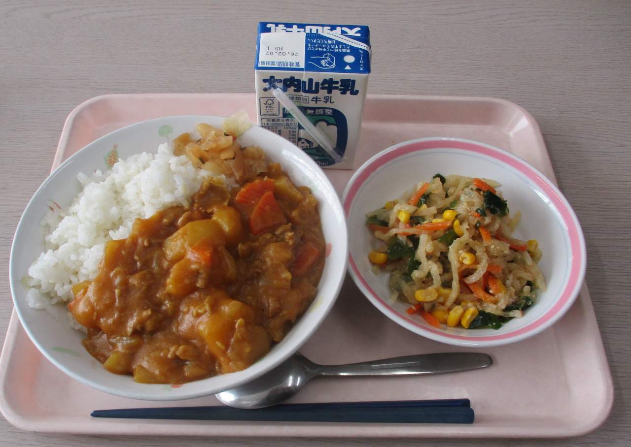 今日の給食は・・・ポークカレーライス、牛乳、大根とわかめのごまサラダ、福神漬けです。