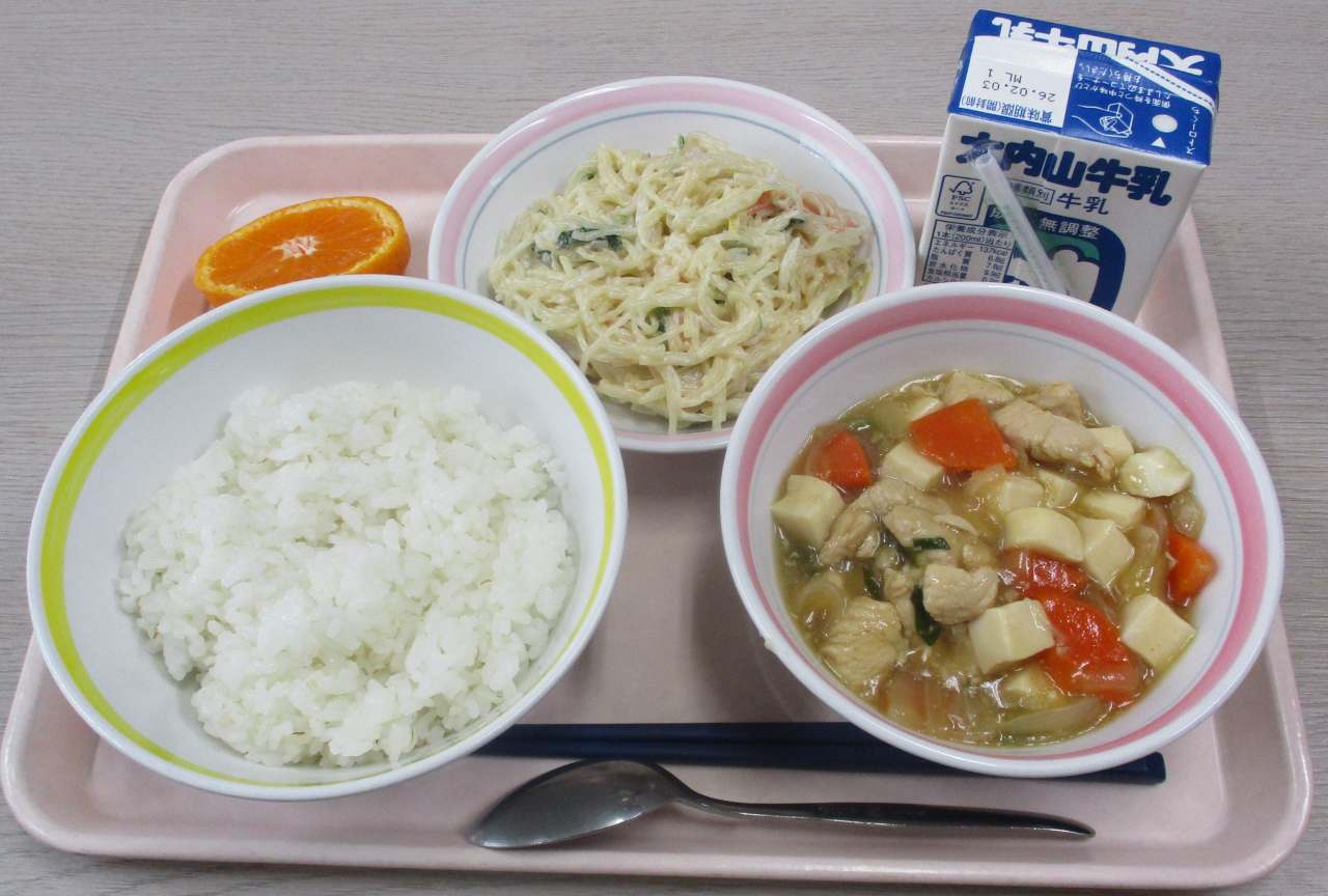 今日の給食は・・・麦ごはん、牛乳、豆腐の中華煮、春雨のマヨネーズサラダ、みかんです。