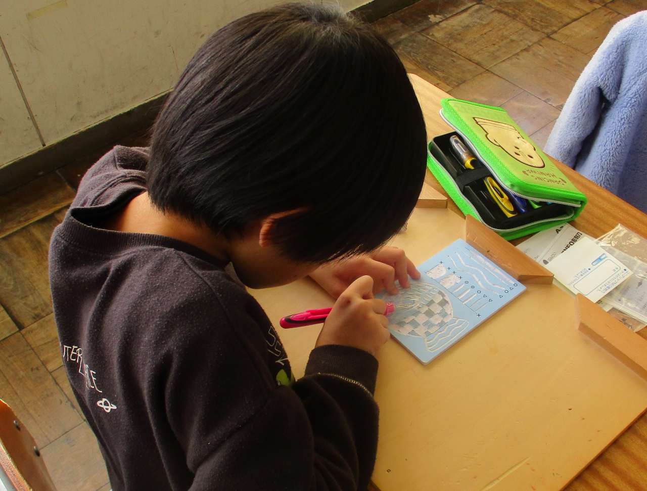 彫刻刀は、使い方を誤れば大きなケガにつながります。 「基礎を学ばないと危ない」という緊張感の中、子どもたちは皆、驚くほど真剣な表情で板に向き合っていました。