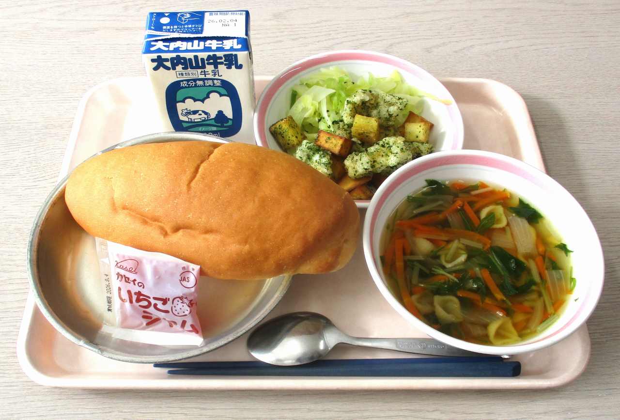 今日の給食は・・・コッペパン、牛乳、イカとサツマイモの青のり揚げ、マカロニスープ、添えキャベツ、いちごジャムです。