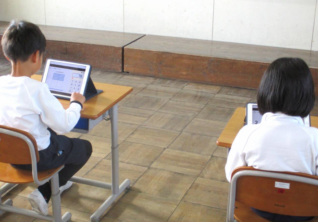 教室を覗くと、子どもたちは自分のタブレットを使い、次々と出題される九九の問題に挑戦していました。迷うことなくスラスラと解答していく姿に、日頃の練習の積み重ねを感じ、とても感心しました。