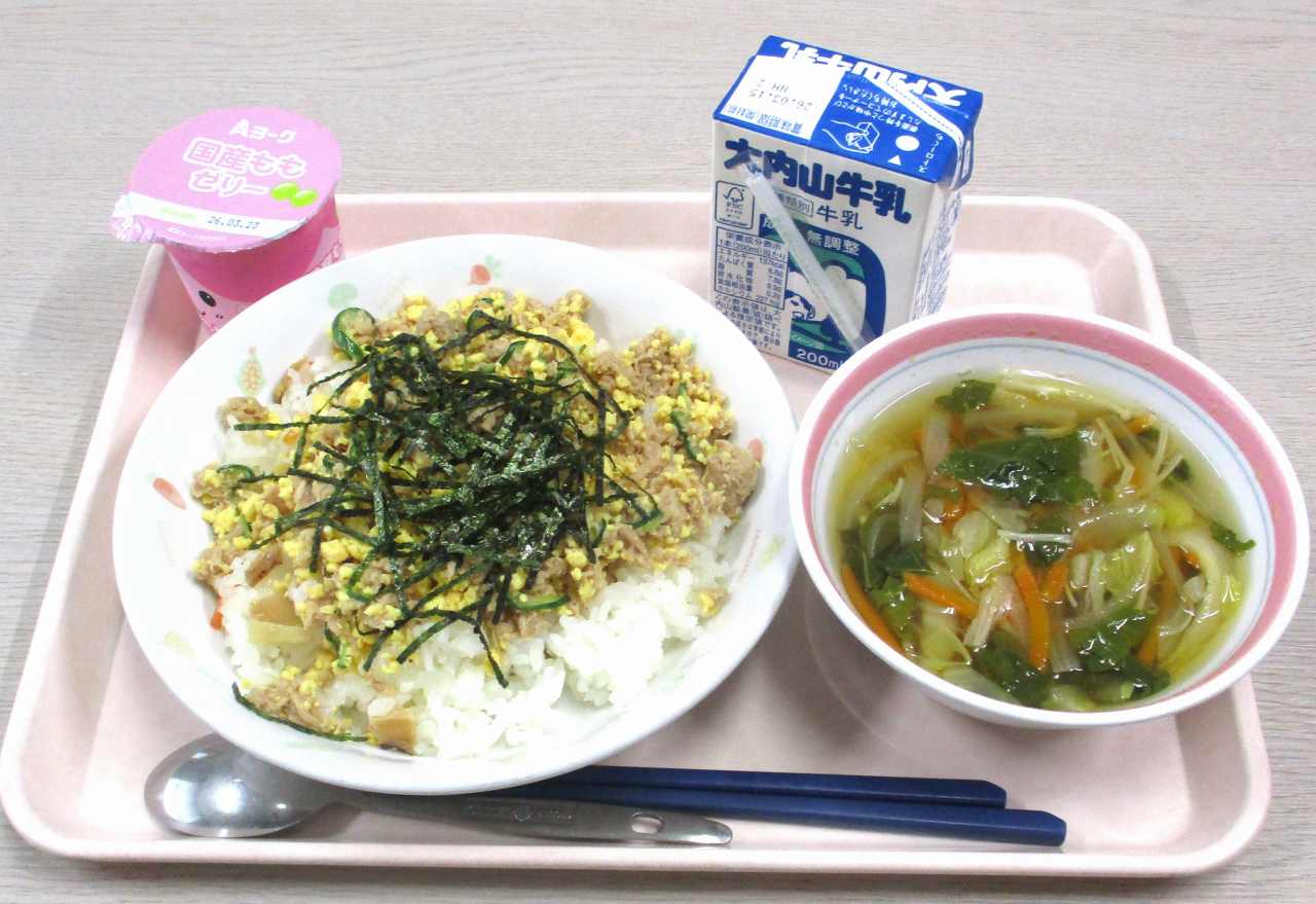 今日のメニューは、ちらしずし、牛乳、なばなのすまし汁、桃ゼリーです。