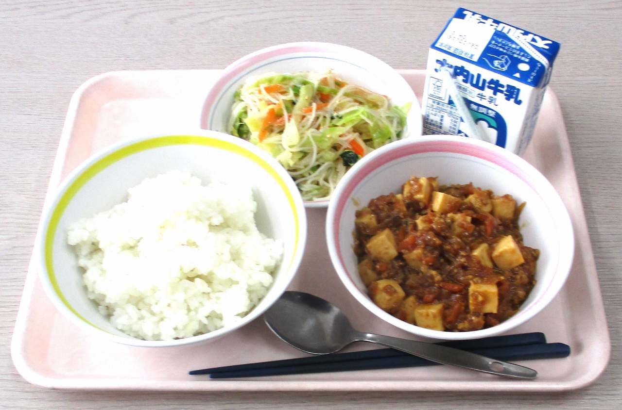 今日のメニューは、麦ごはん、牛乳、麻婆豆腐、春雨サラダです。