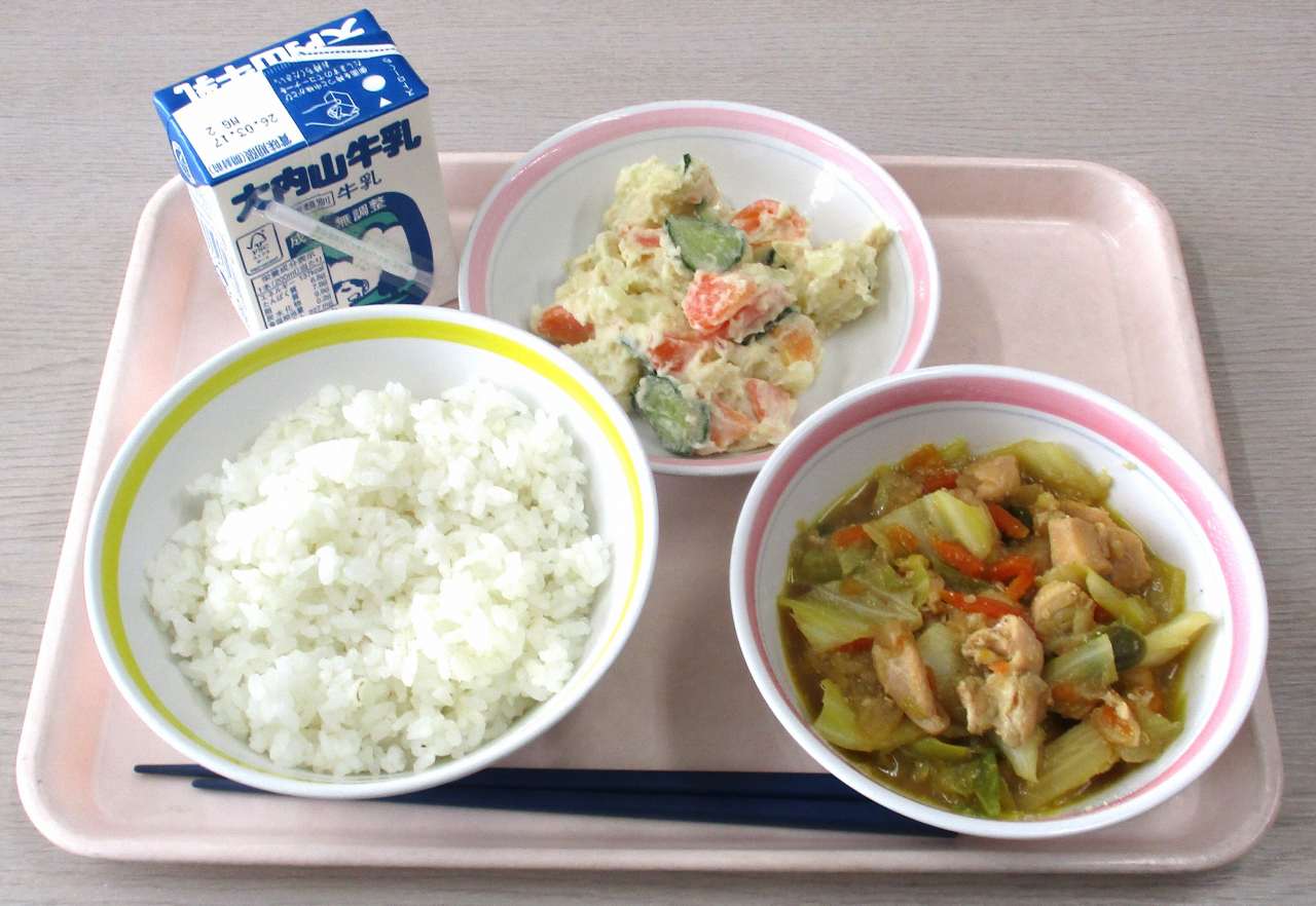 今日のメニューは、麦ごはん、牛乳、けいちゃん、和風ポテトサラダです。