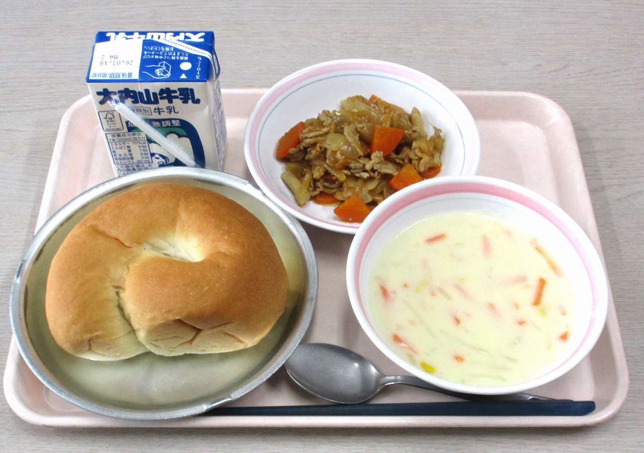 今日のメニューは、米粉入り丸形パン、牛乳、豚肉と野菜のケチャップ炒め、クリームスープです。