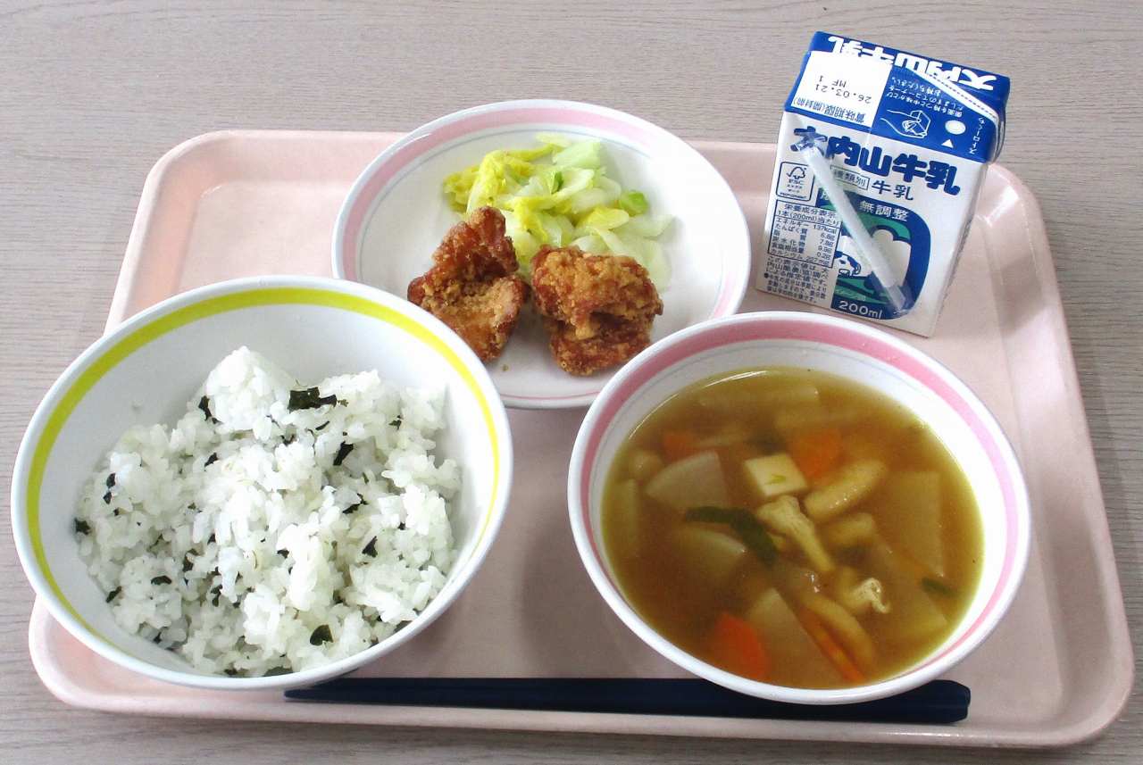 今日のメニューは、わかめごはん、牛乳、鶏のから揚げ、けんちん汁、添え白菜です。