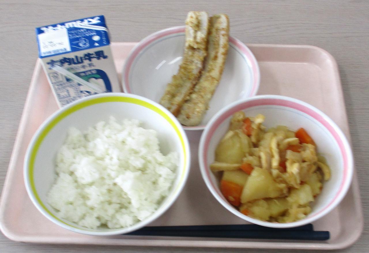 乳、ちくわのマヨネーズ焼き、じゃがいもの煮物です。ちくわのマヨネーズ焼きは、ごまの香ばしさとマヨネーズのコクが絶妙で、食欲をそそる味付けです。