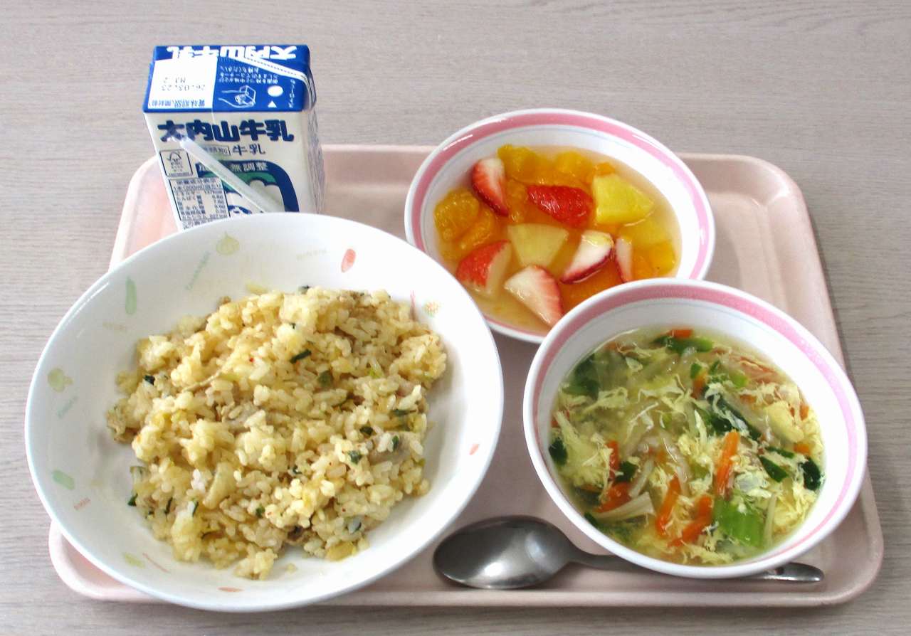 今日のメニューは、キムチチャーハン、牛乳、卵スープ、イチゴ入りフルーツポンチです。