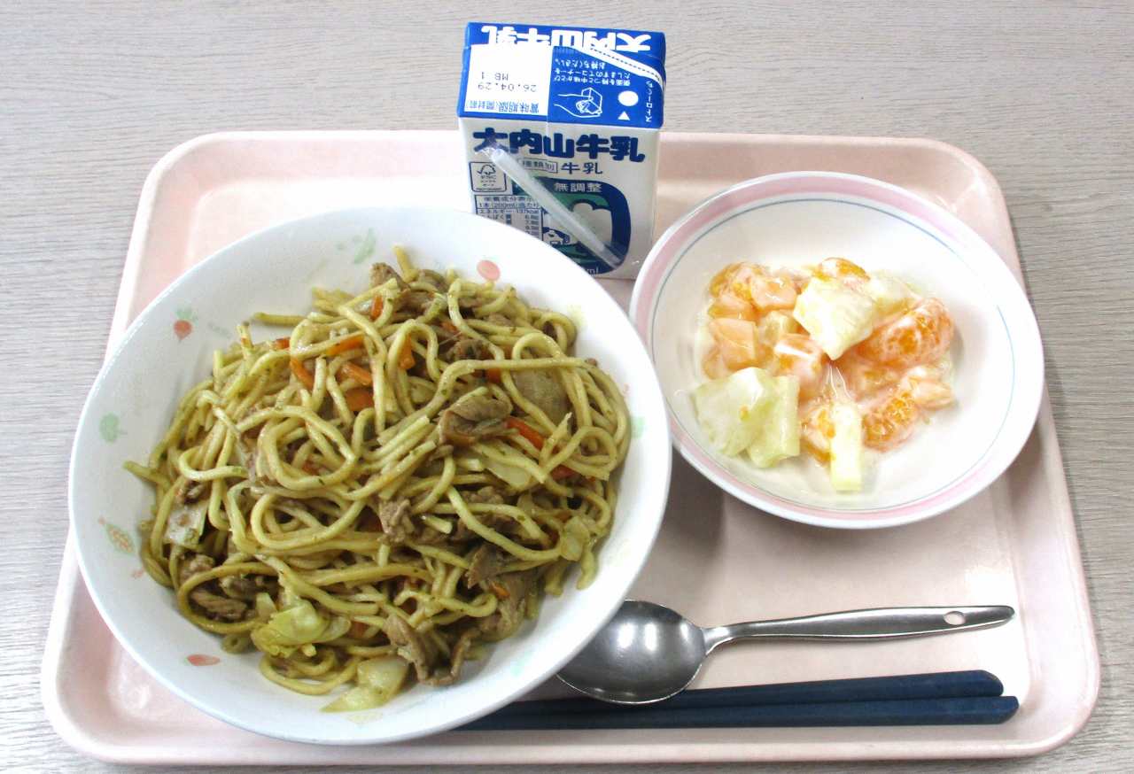 今日のメニューは、焼きそば、牛乳、フルーツヨーグルト和えです。