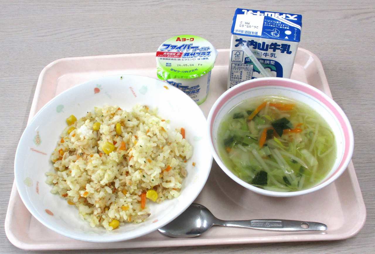 今日のメニューは、ツナのピラフ、牛乳、野菜スープ、ファイバーヨーグルトです。