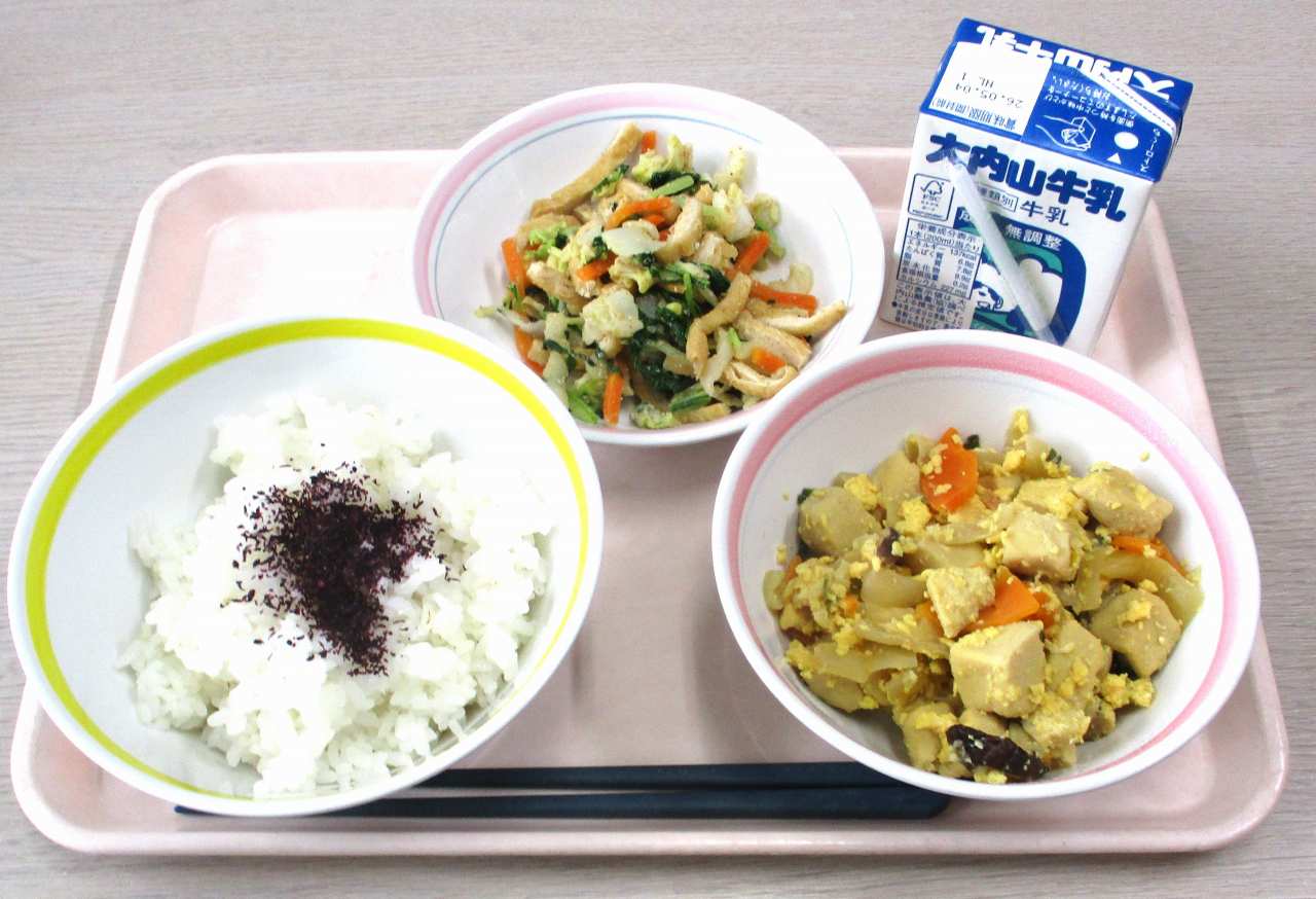 今日のメニューは、麦ごはん、牛乳、高野豆腐の卵とじ、胡麻和え、しそふりかけです。