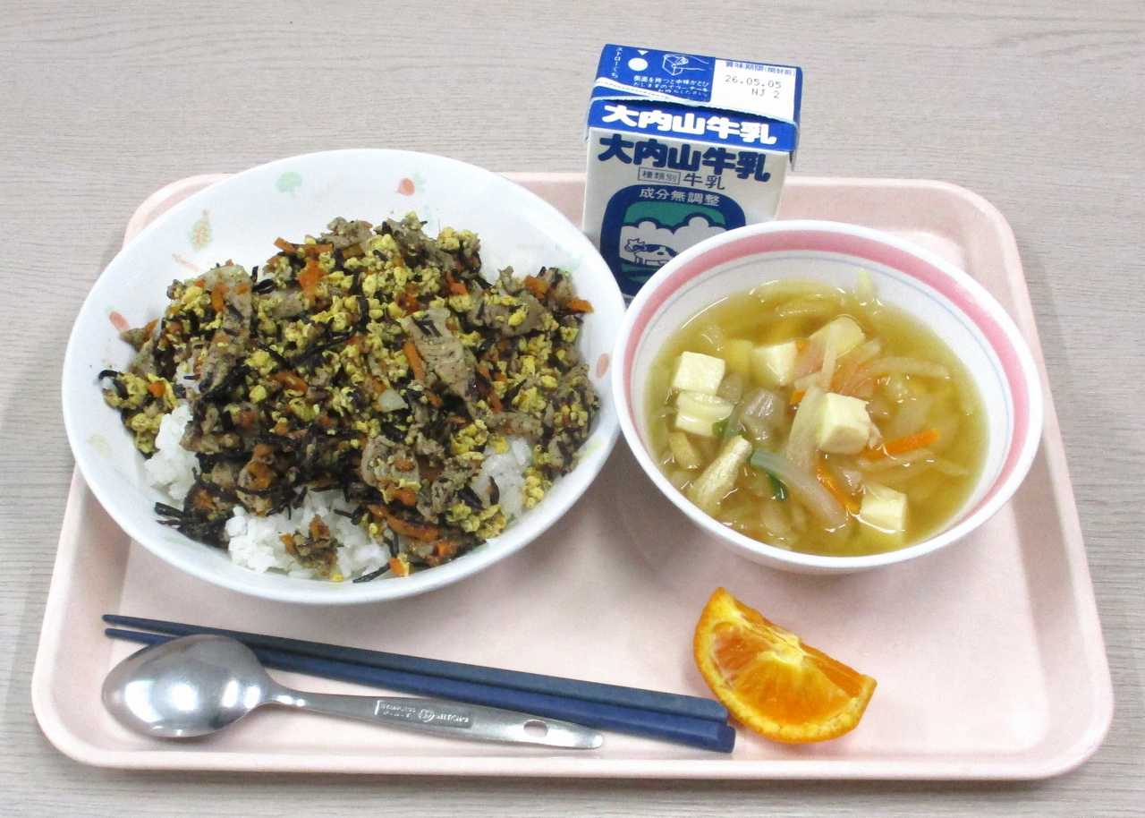 今日のメニューは、ひじきと豚肉のご飯、牛乳、すまし汁、カラです。
