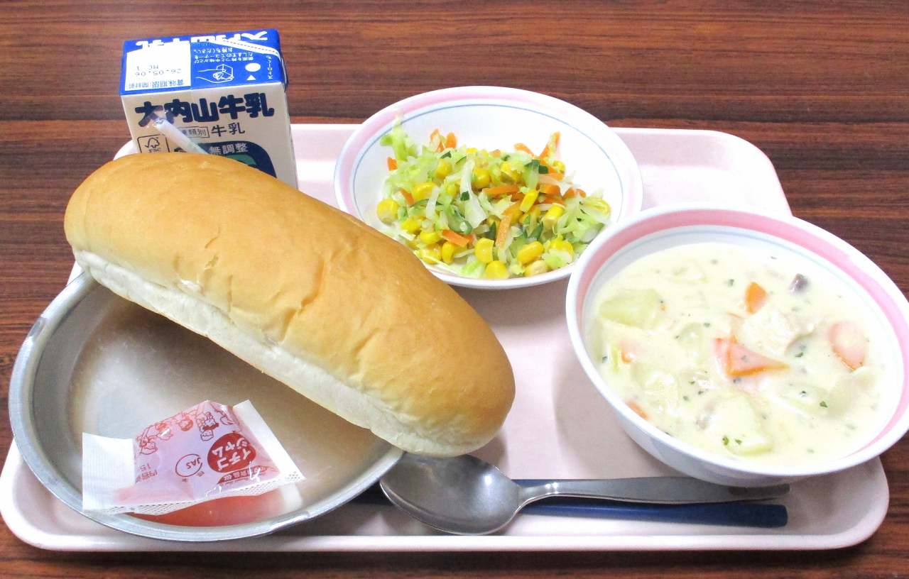今日のメニューは、コッペパン、牛乳、クリームシチュー、フレンチサラダ、イチゴジャムです。