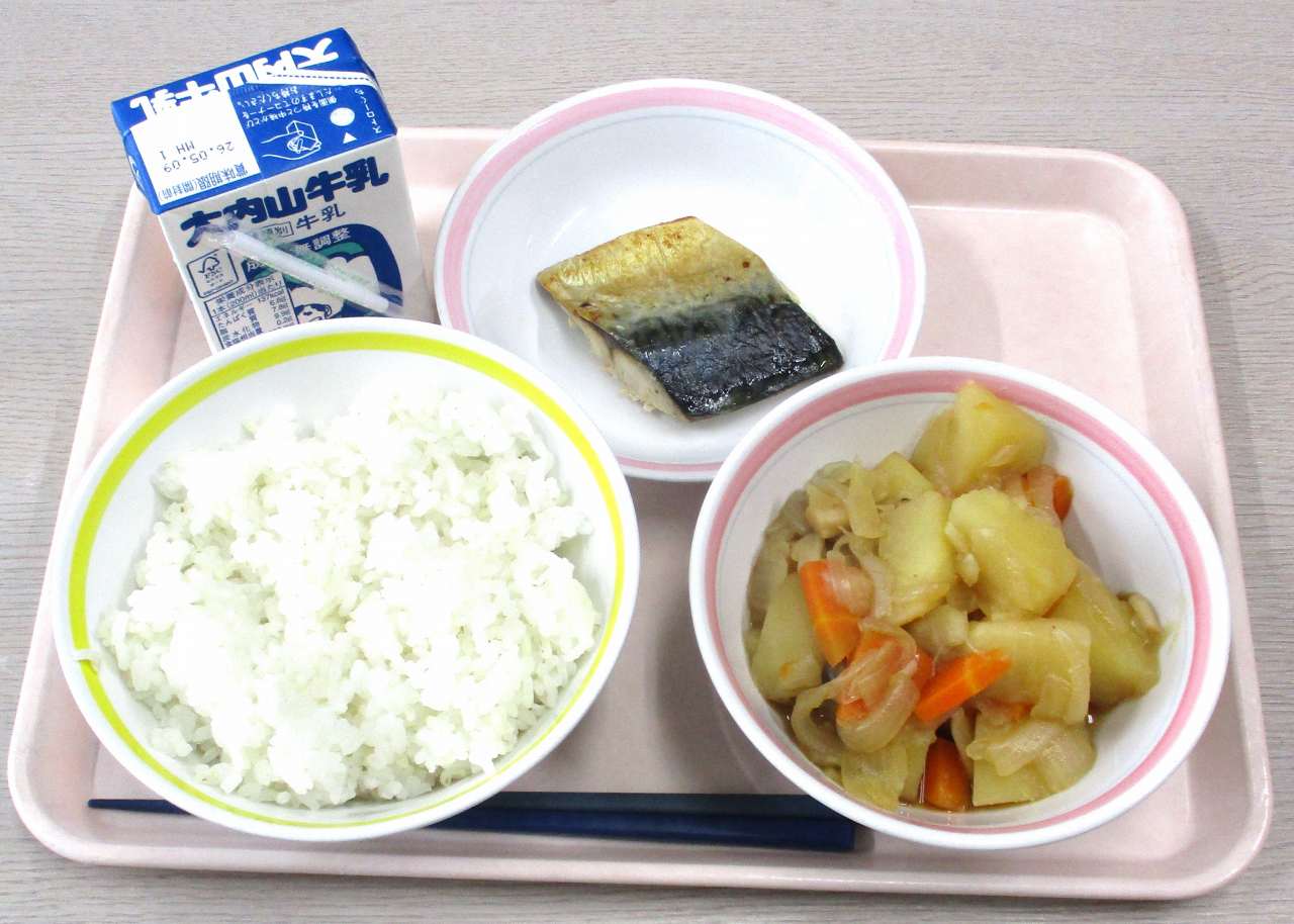今日のメニューは、麦ごはん、牛乳、サバの塩焼き、じゃがいもの煮物です。