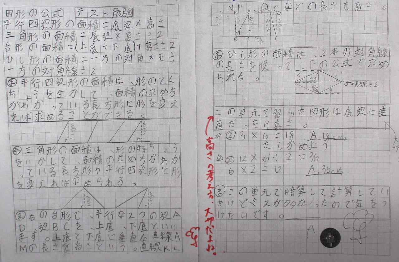 算数のノート・・・きれいな字で、枠線も使いながら、上手にまとめてあります。ノートの最後には、気を付けたいことも書いてあって、すてきです。