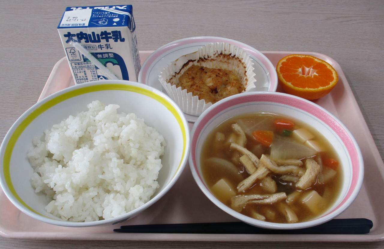 今日の給食は・・・麦ごはん、牛乳、鶏の味噌マヨネーズ焼き、けんちん汁、みかんです。