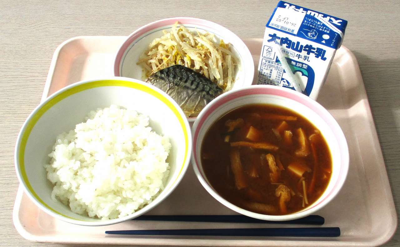 今日の給食は・・・麦ごはん、牛乳、サバの塩焼き、もやしの胡麻あえ、かぼちゃのみそ汁です。