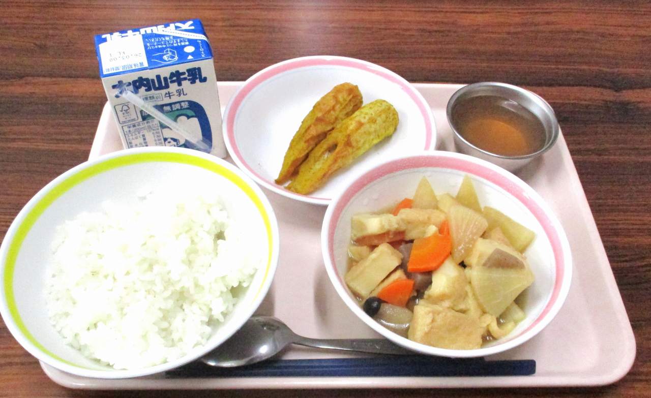 今日の給食は、麦ごはん、牛乳、ちくわのカレー焼き、大根の煮物、アセロラゼリーです。