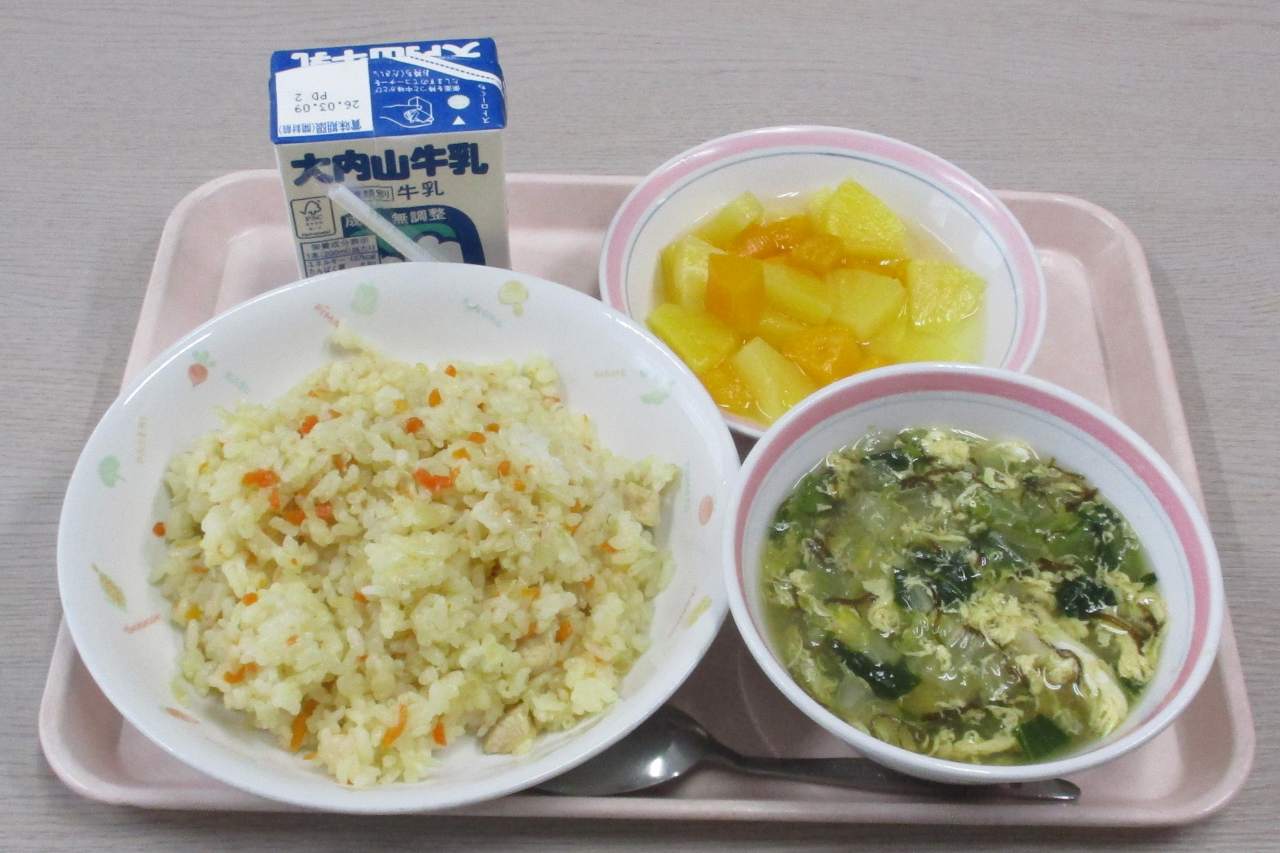 今日のメニューは、チキンピラフ、牛乳、もずく入り卵スープ、フルーツポンチです。