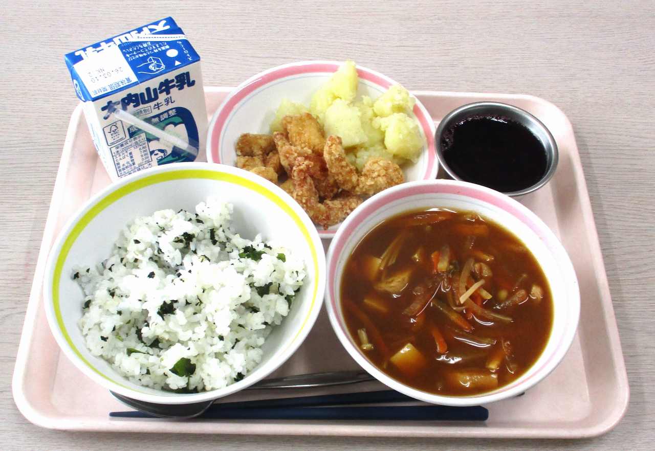 今日のメニューは、わかめごはん、牛乳、鶏のから揚げ、みそ汁、こふき芋、手作りブドウゼリーです。