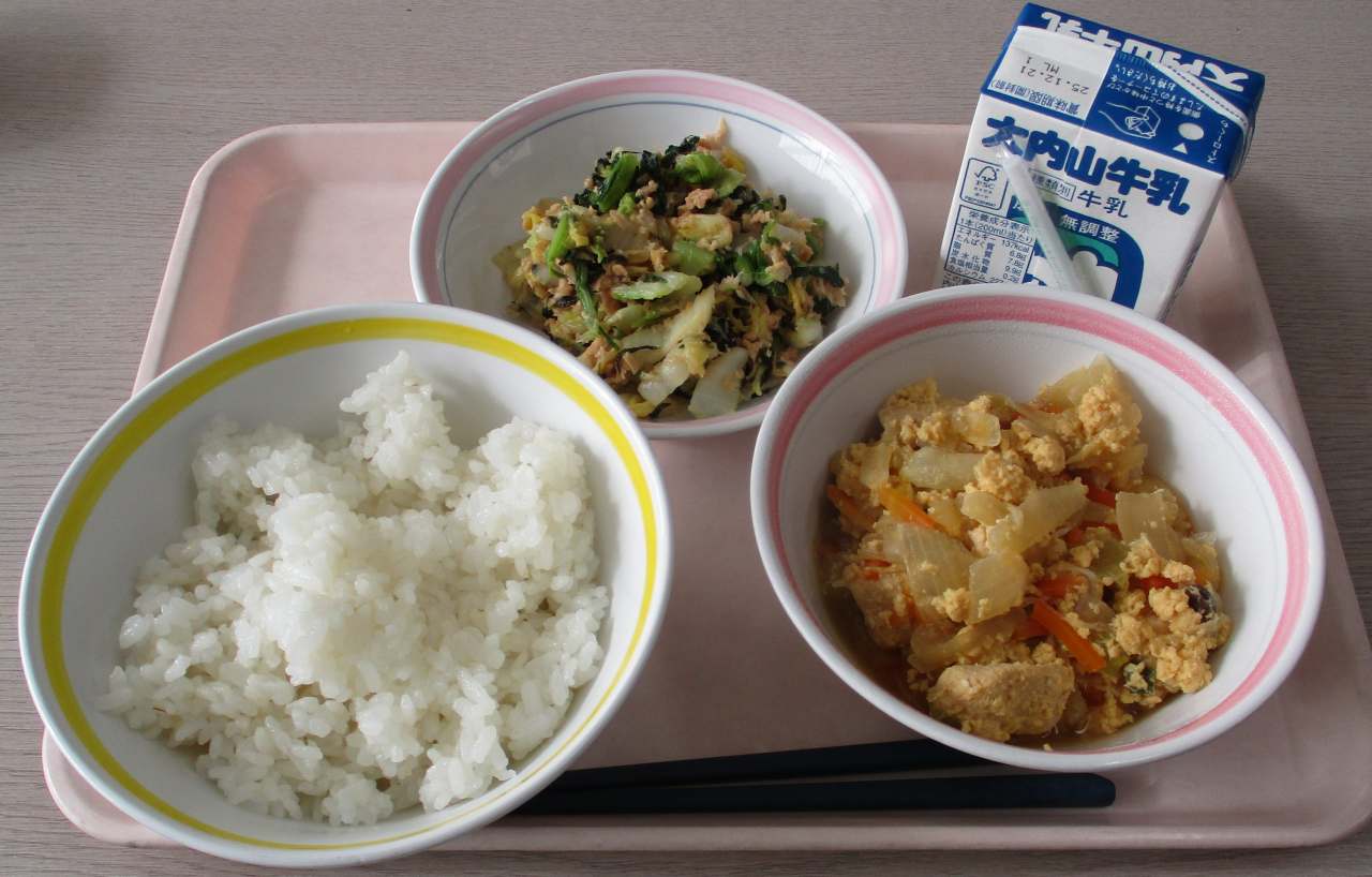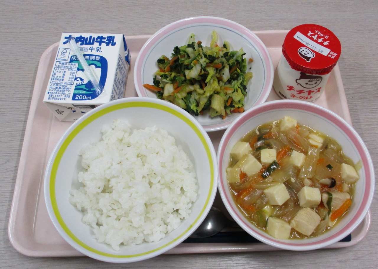 今日の給食は・・・麦ごはん、牛乳、豆腐のうまに、ひたし、ヨーグルトです。