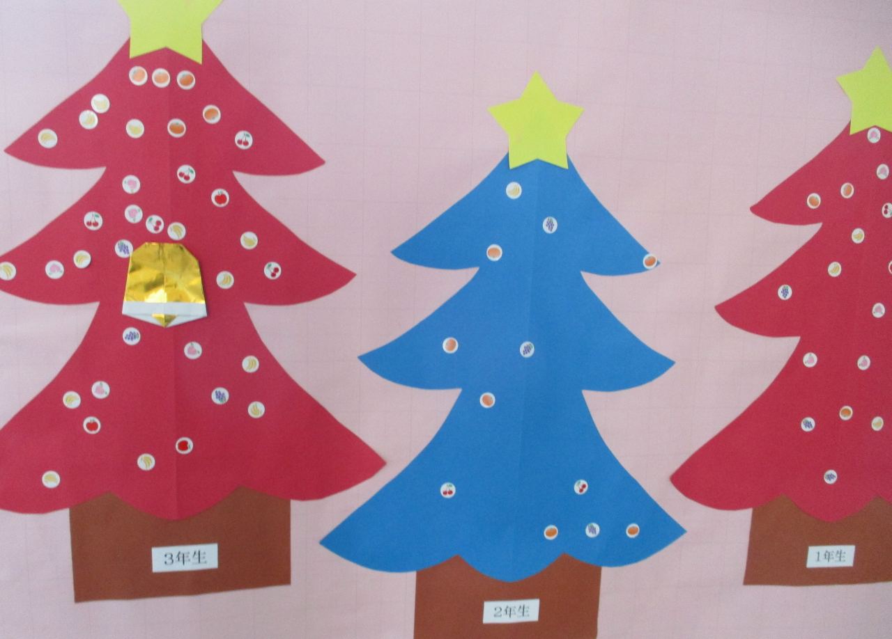 「もうすぐ楽しいクリスマス。本を借りるとシールがもらえます。自分の学年のツリーに貼って、すてきなクリスマスツリーを作りましょう。」
