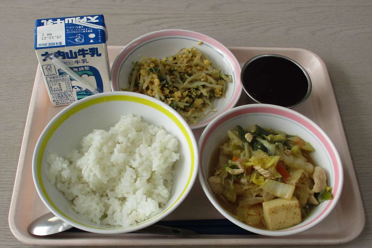 今日の給食は・・・麦ごはん、牛乳、とりすき煮、もやしのごまず和え、手作りブドウゼリーです。