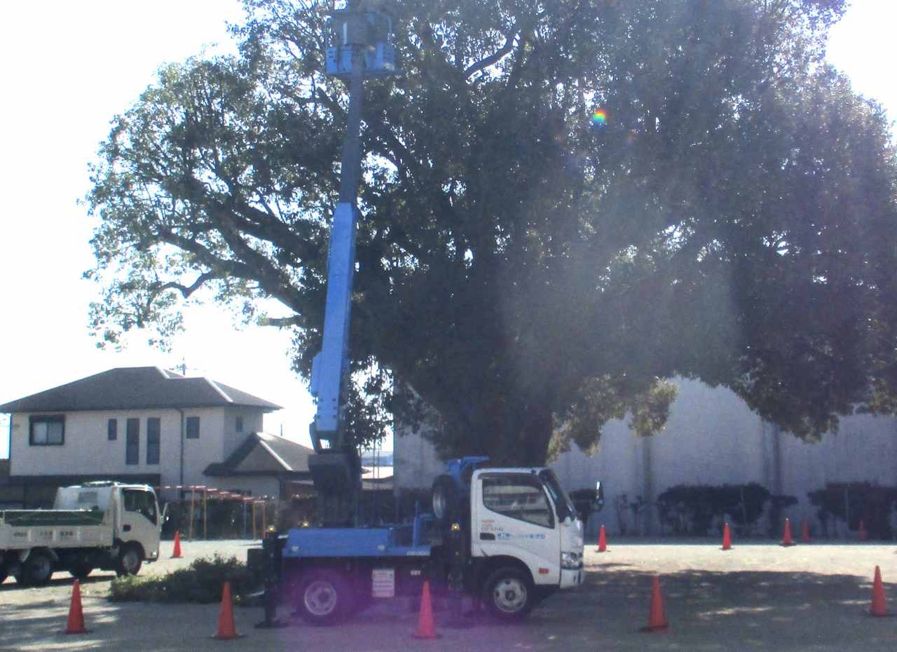 高所作業車を使って、高く伸びた枝や生い茂った葉をきれいに切り落としていただきました。