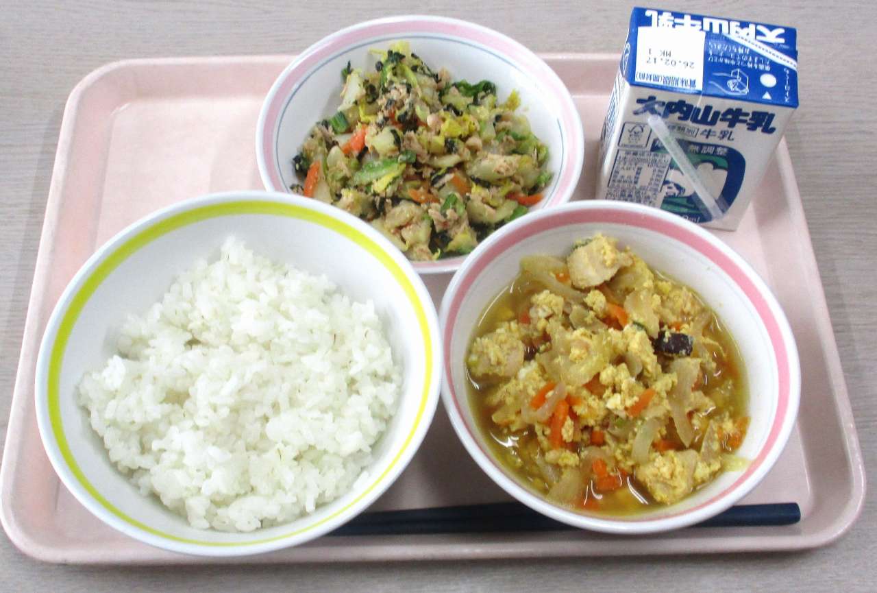 今日の給食は・・・シラスご飯、牛乳、卵と野菜の炒め物、豚汁です。