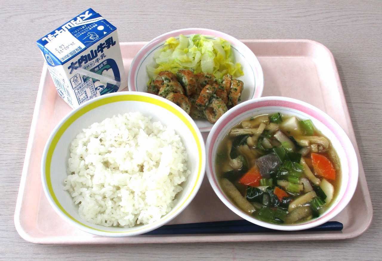 今日の給食は・・・麦ごはん、牛乳、ちくわの磯部揚げ、添え白菜、のっぺい汁です。