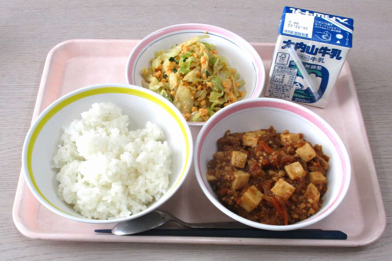 今日の給食は・・・麦ごはん、牛乳、麻婆豆腐、卵とチンゲン菜のサラダです。