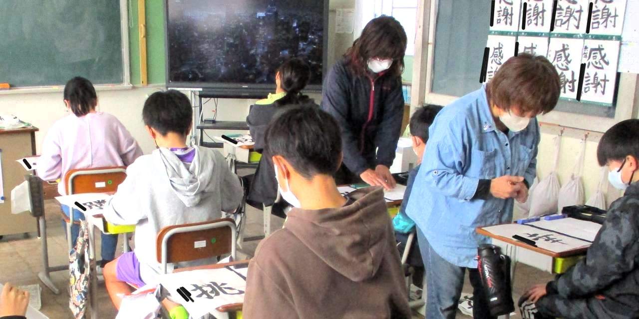 ちなみ先生の熱心なご指導のもと、一画一画を丁寧に、かつ力強く書き進める子どもたち。普段の賑やかな教室とは一変し、紙と筆が擦れる音だけが響く、深い集中力に包まれました。その真剣な表情からは、最高学年としての自覚と、未来への強い意志が感じられました。