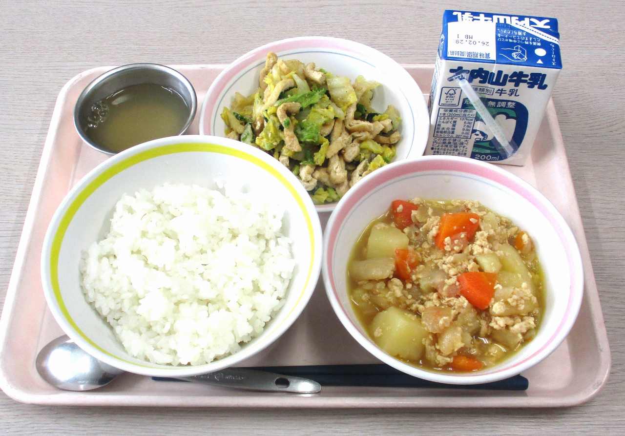 今日の給食は・・・チキンカレーライス、牛乳、キャベツとわかめのフレンチサラダ、福神漬けです。