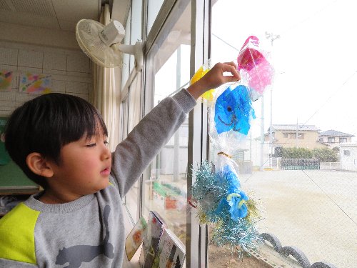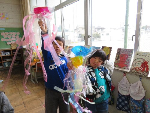 1年生は、プチプチやシャラシャラテープを使って、キラキラのたこや魚をつくりました。できあがった作品もすてきですが、いちばんすてきなのは作っている途中の子どもたちの表情です。「これは○○で、ここからしっぽが出て…」とお話をしながら夢の世界にひたっています。