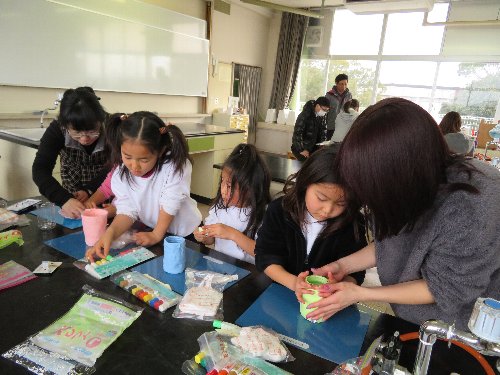 ペットボトルやプラスチックのコップに絵の具でパステルカラーに染めたのび〜る粘土を貼り付け、世界に一つだけのぺん立てを作りました。粘土の感触が子どもたちは大好き。絵の具で色をつけてもよごれない優れものの粘土で、楽しいひとときを過ごしました。