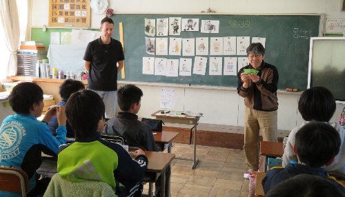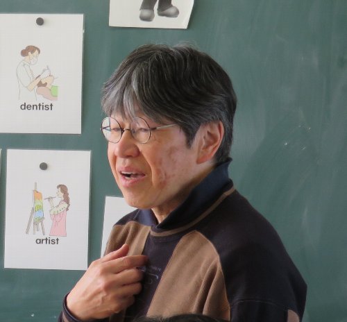 ALTのスティーブ先生と中学校英語科の中村先生とのコラボ授業が実現しました。音声中心の小学校の外国語活動から中学校の英語科への移行をスムーズにするための小中連携の一環です。当日のターゲットは「職業」。先生の指示した職業を見つけて指さす「早押しクイズ」式のアクティビティと、相手を見つけて「何になりたい?」と聞かれたら、「〜になりたい。」と自分のカードにある職業を答えるアクティビティの2つを楽しく行いました。