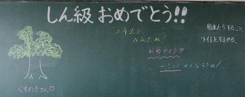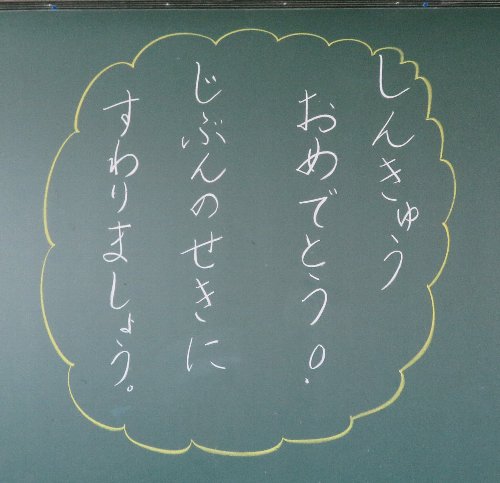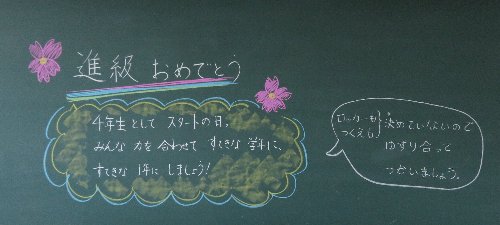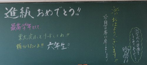 4年・5年・6年教室も、担任の先生からの温かい迎える言葉でスタート。でもこれ、実は担任の先生がわからないように、教室を交換しあって書いたのです。