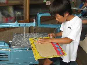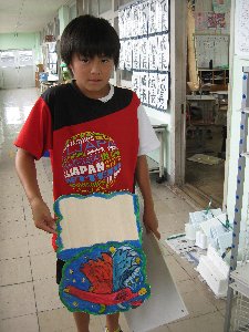 5年生の図工では、思い思いのデザインでマイボードづくりに取り組んでいます。下絵を描き彩色したあと、電動のこぎりでカットします。ヤスリできれいに磨き、ニスをぬったらできあがり。世界に1つだけのマイボードです。