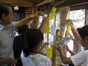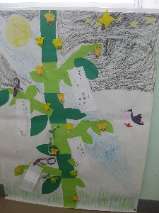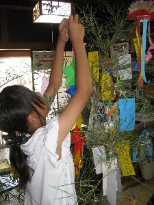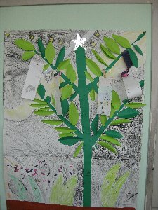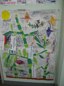 4年生は、他の学年とはひと味ちがったささ飾りをつくりました。ささも自分たちで模造紙に描き、そこに願い事を書いた短冊を‥。自然のささもいいですが、各グループの個性あふれるささも、とってもすてきです。さすがは、アイデアいっぱい4年生。