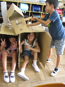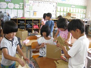 いつも楽しいアイデアを見せてくれる2年生が、またまた楽しい活動に取り組んでいました。教室に持ち込んだ大量の段ボール箱を、カッターで切ったり、ガムテープで貼り付けたり、いったい何を作っているのでしょうね。聞けば19日に予定している「お楽しみ会」の準備だとか。「3連休、楽しみやね。」の言葉にも、「お楽しみ会の準備したいで、休みたくないよう!」とのお返事。19日のお楽しみ会は、ぜひのぞいてみたいと思います。