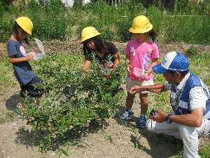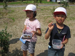 7月18日(火)東大淀まちづくり協議会の主催により、1・2年生がブルーベリー収穫体験会に参加しました。はじめに「ブルーベリーは赤ではなく、黒っぽいのが熟しているから、それをとりましょう。」と、まちづくり協議会会長、岡本忠佳さんから教えてもらい、用意したタッパーにブルーベリーの実を摘んでいきました。