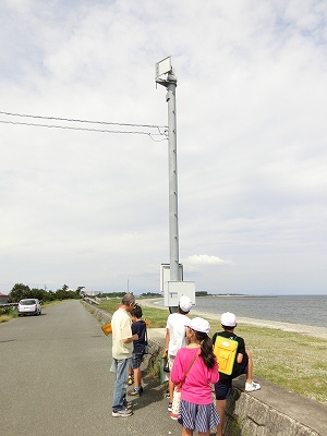 10月4日(火)4年生が総合的な学習の時間を活用し、防災タウンウォッチングを行いました。『大きな地震が発生した時に危険なもの、安全に避難できる場所などについて、実際に自分たちが暮らしている地域を歩いて確認する』ことを目的に、県教育委員会から渡辺先生をお招きし、地域の岡本さん・北村さん・浜口さんのご協力をいただき実施しました。