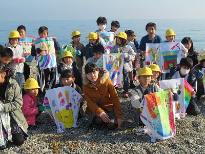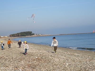 1年生が6年生に手伝ってもらいながら、12月21日(水)に大淀海岸でたこ揚げを行いました。1年生は元気に海岸を走りまわり、6年生は息を切らせながらペアの児童の後を追っかけていました。