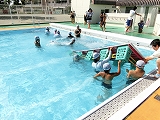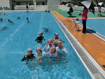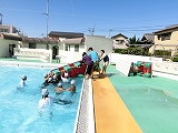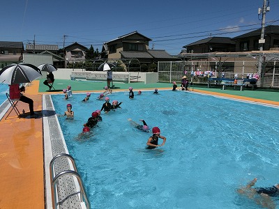 プール実行委員会主催により、7月21日(火)〜8月5日(水)まで、実施されました。子どもたちは、延べ418人参加し、夏の暑いひと時をとても涼しく・楽しく過ごすことができました。最後、6年生にプールに沈めてあったプラスチックの台を引き上げてもらいました。