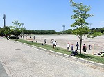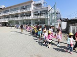 ※左の写真は出発前に、教頭先生から連絡を受けている様子です。真ん中の写真は、上級生と手をつないで出発する時の様子です。右の写真は、出発からおよそ1時間、休憩をとるために明野高校に着いた時の様子です。