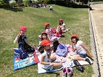 左はつり橋を渡ってグラウンドへ行く写真、真ん中はそれぞれの場所で楽しくお弁当を食べている写真、右は昼食後広いグランドで遊んでいる写真です。